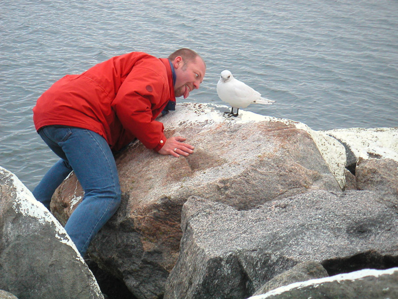 Jeg vil blot for en sikkerheds skyld fortælle, at der er tale om 2 fotos der er sammenkopieret. Henrik Kisbye (det er ham til venstre) har ikke møvet sig ind på den skønne måge i virkeligheden.