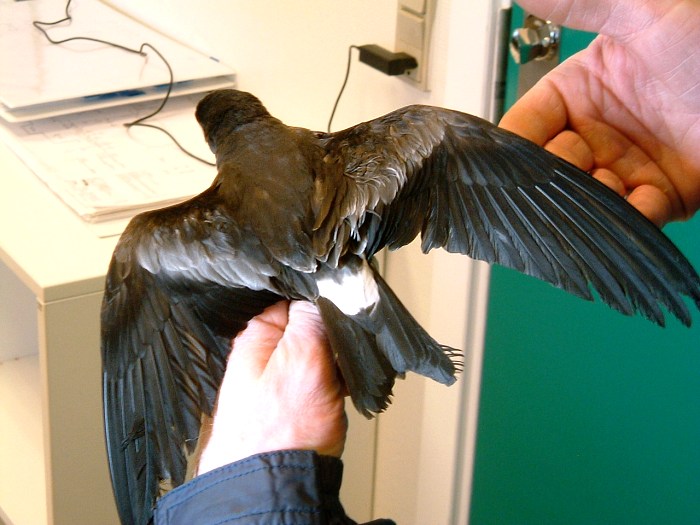 Beskrivelse: Det var en af mine kolleger på RGS 90´s kommende PVC genbrugs anlæg, Steen Larsen, der fandt den store stormsvale. Han kontaktede mig, og jeg fangede og ringmærkede den. Efter et ophold i mine varme hænder var den atter klar til at udforske de indre danske farvande med venlig hilsen Thomas Stigfeldt