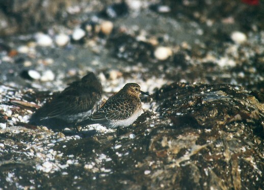 Kort næb med hvidt "underbid" ved undernæbbets fæste) samt gulbrunt anstrøg på hele brystet ses. En meget vigtig karakter, hvis man om efteråret vil finde andre arter i flokke af unge Almindelige Ryler, ses ved sammenligning med den Almindelige Ryle i baggrunden: I hvertfald frem til først i oktåber har ung Almindelig Ryle tydeligt mørkplettede flanker, hvilket på afstand gør, at man ikke opfatter flankerne som så slående hvide som hos Bairdsrylen; kendetegnet kan ofte let testes, når de unge - hvidflankede - Krumnæbbede Ryler dukker op mellem Almindelige. Fra oktober og fremover forsvinder disse mørke pletter (kaldet "den plettede trekant", da de omfatter området mellem kno, bryst og ben) - men det gør også de andre arter, den kan forveksles med. Har dog så sent som sidst i januar set ung Almindelig Ryle med plettede flanker.