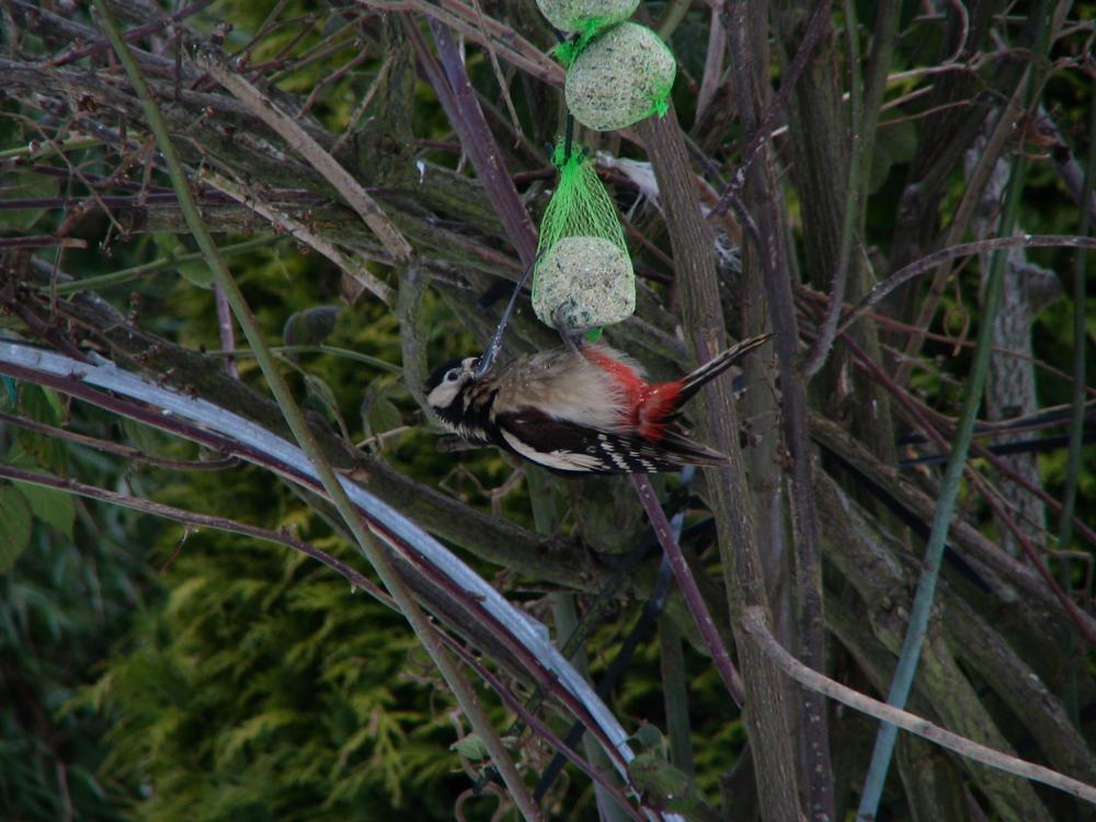 Beskrivelse: Sidste år i maj indsendte jeg et billede af en stor flagspætte, hvis særkende er et endog meget langt undernæb. Denne fugl havde forud huseret her i nabolaget i flere år, men har dog ikke ladet sig se i min have de sidste 6 mdr. - indtil i dag. Pludselig hang den der i fodertræet mellem sjagger og kvækerfinker samt andet havekravl. Herligt at denne prægtige flyvende og hakkende kammerat stadig vil nyde et måltid her i disse beskedne omgivelser - herligt at den lever. Det andet billede af fuglen ses <a target='_blank' href=' http://www.netfugl.dk/pictures.php?id=showpicture&picture_id=2624'>her</a>.