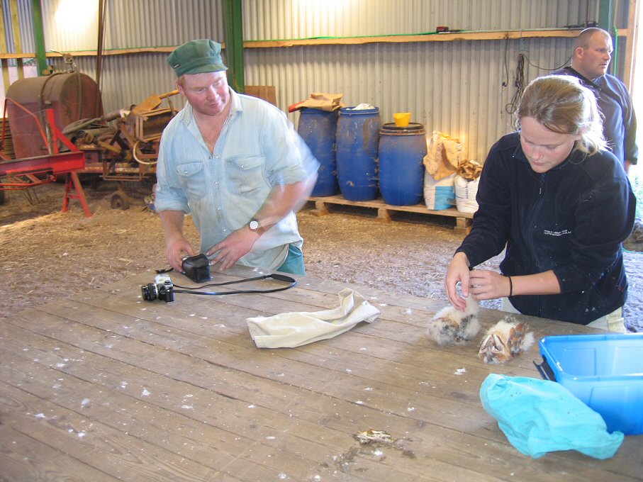 Til venstre ses Flemming, der er den stolte ejer af laden med slørugle-kassen, mens Elsemarie håndterer ungerne.