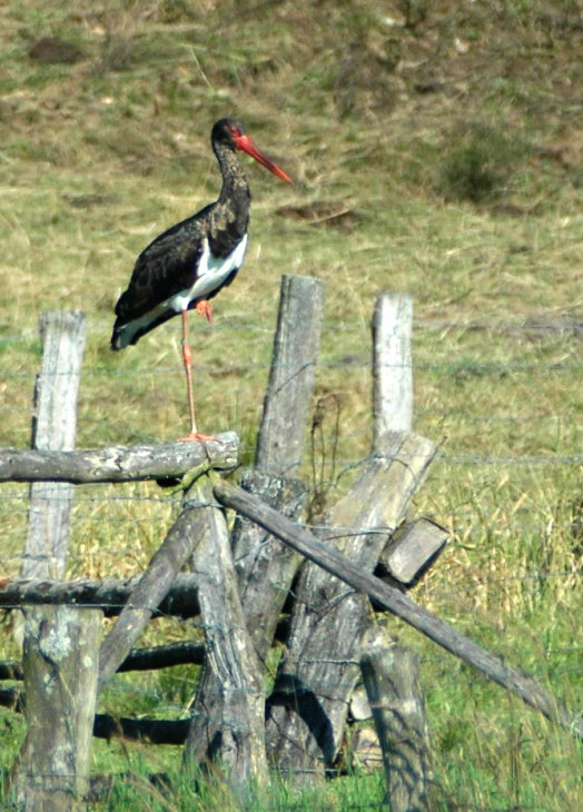 Well, here enclosed a picture of a 2nd calendar year Black Stork: the bird was ringed on the nest in June 2004 in Luxembourg and is now back in Luxembourg, some 40 km nothwards from its nesting site. It has a colour-ring on its hidden leg. Here you can see the bill and leg colouration and of course the remaining juvenile feathers on the throat.