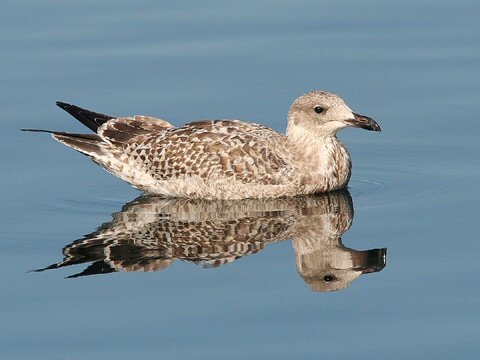 Beskrivelse: 1k Sølvmåge argentatus, der viser lidt om, hvor meget vandspejling kan påvirke proportionerne på en fugl.