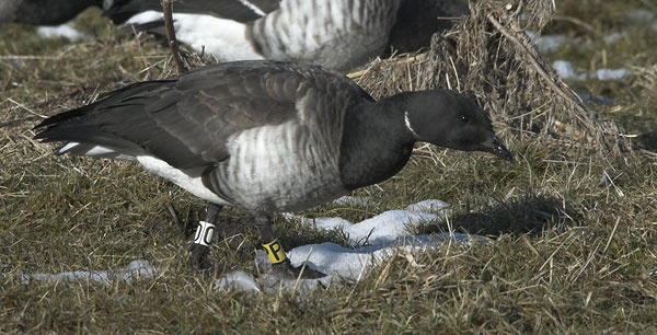I disse år ses stadig flere af de lysbugede knortegæs på vintersæd og strandenge, fordi deres foretrukne føde - ålegræsset, forsvinder mange steder. Omkring 1% af bestanden er farveringmærket - og databasen indeholder 11.200 aflæsninger. Observationer af farvemrk. fugle kan sendes til mig - pc@dmu.dk. Jeg har brug for meget præcis viden om hvad der er set på hvilke ben (eller et kanon godt foto som dette!). Se iøvrigt mere om mærkningerne på
