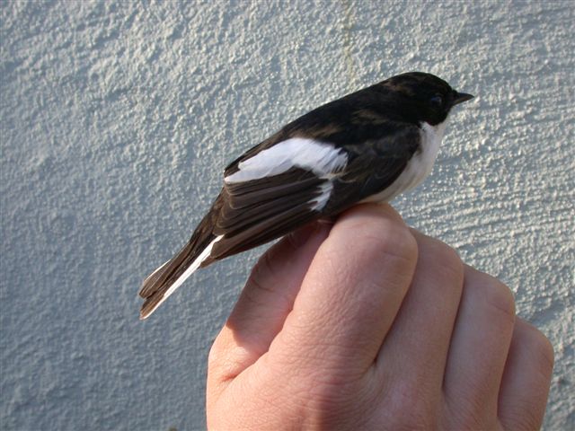 Beskrivelse: Vi fangede i dag en suspekt fluesnapper ved Blåvand. Uden tvivl en lidt afvigende Broget Fluesnapper, eller måske hybrid Broget Fluesnapper x Balkanfluesnapper. Det var Jens Hjerrild der pillede fuglen ud og kunne med det samme konstatere, at denne var lidt speciel med alt det hvide den havde i vingen. Det hvide nåede også helt ud på 4. hsf. Iflg Svensson er dette ret så sjældent på Broget Fluesnapper. Vi kiggede nærmere på fuglen og især på halen, der viste typiske tegninger for Balkanfluesnapper. Det hvide på yderfanen af yderste halefjer gik helt ned og rundede halespidsen, se fotos. Dette skulle indikere Balkanfluesnapper. Også underhalefjerene viste Balkanfluesnapperkendetegn. Vingelængden lå i overlapningszonen for begge arter. 2. hsf lå mellem 5/6, hvilket indikerer Broget Fluesnapper, kan dog sjældent ses hos Balkanfluesnapper. Og hvorfor skulle man lige fange en Balkanfluesnapper med den sjældneste vingeformel for arten. Mange hilsner Bent