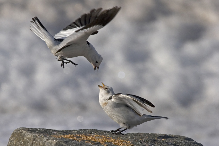 Beskrivelse: Så er snespurven for alvor kommet til Grønland, og de "går" gerne på kanariefugleblanding. Billedet er taget på 1/2500 og alligevel er vingerne ikke helt frosset - sjovt!