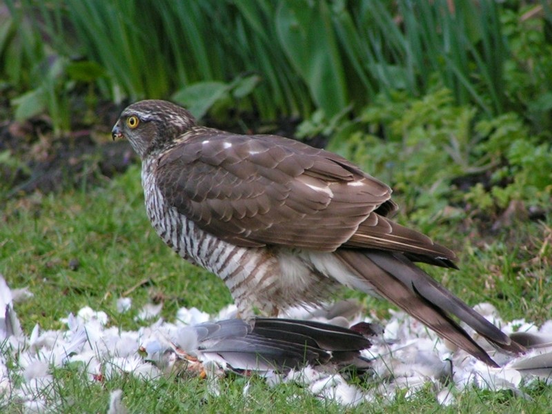 Denne fugl slog ned i vor have med en due i kløerne kl.: ca.: 07:30. Først kl.: ca. 08:00 vækkede min kone mig og sagde der var noget jeg måtte komme ned og se. Den næste time optog jeg 56 billeder af varierende kvalitet og 12 video-sekvenser af optrinet i en afstand af 4-5 meter, inden fuglen tog resten af due og fløj væk. Jeg bedømte fuglen til en Duehøg, men ekspertisen mener at det nok er en Spurvehøg.