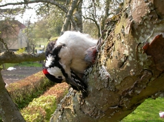 Beskrivelse: Hermed et foto at en død Stor Flagspætte, som fruen fandt tidligt i morges i et af havens æbletræer.