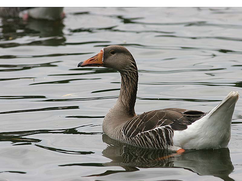 Én af de tre gæs, der holder sammen i flok i Utterslev Mose i øjeblikket. Som en tilføjelse til "billed info" kan bemærkes, at alle tre fugle har bredere hvidt endebånd på halen end grågæs, og alle samme størrelse - større end Grågæs, og med en grovere, dybere og mere "honkende" stemme.