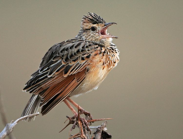 Det er en Rufous-naped Lark, som Rune også er inde på. Bemærk det store røde felt i vingen, som er synligt på billedet. Rufous-naped Lark kan forveksles med Red-winged Lark, der ligeledes har et stort rødt vingefelt, men er meget større og desuden geografisk adskilt fra Rufous-naped. Flappet Lark er mindre og med kortere næb,