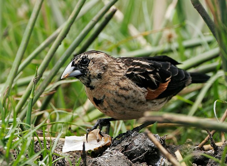 Fan-tailed Widow kendes på sin rødbrune skulder, der ses tydeligt på billedet. Fan-tailed Widow er i øvrigt ganske alm. i Ngorongoros fugtige græsland.