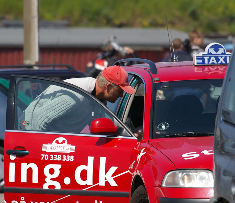 Beskrivelse: Rolf betaler taxa fra Kastrup Lufthavn efter at have fløjet fra Aalborg
