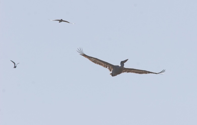 En hættemåges vingefang er ca. 90 cm, hvis vi sætter det lavt. Hvis vi antager, at 'Pellekanen' og mågen er nogenlunde lige langt væk fra Ejnar (fotografen), så kan vi faktisk anslå, at Pelikanens vingefang er ca. 3,15-3,20 meter! Nogenlunde lige efter bogen, men alligevel fantastisk facinerende. Krøltoppet Pelikan er simpelthen Europas største fugleart.
