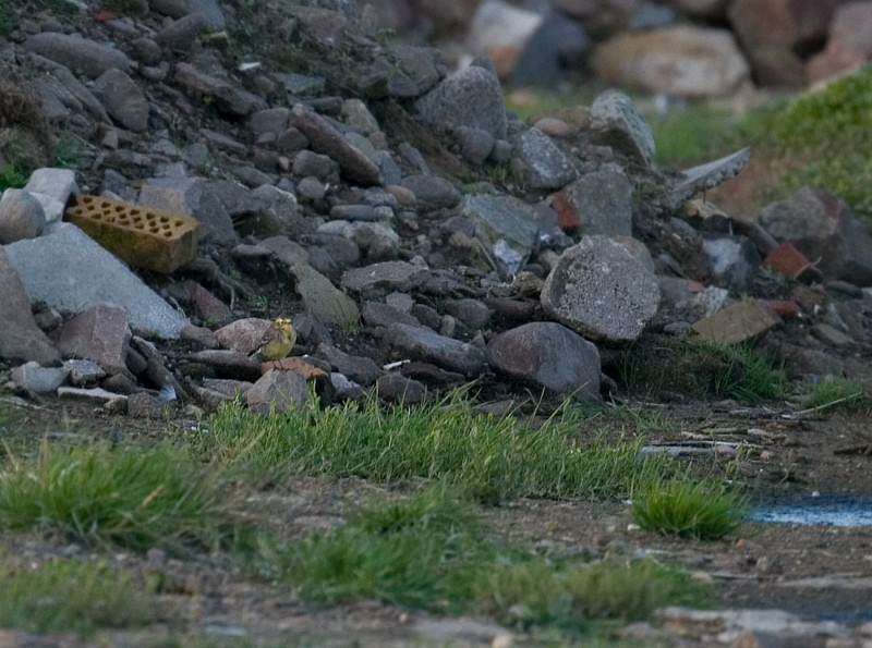 Beskrivelse: Havde lige 45 min. mellem prøvetagninger i mine igangværende forsøg på Bornholm Lakseklækkeri. Dem besluttede jeg at bruge med kikkert og kamera på opfyldningen lige ved siden af. Området var super fedt med mange små lyngagtige planter og små vandpytter over det hele. Bekkasiner og gule vipstjerter fløj op for hvert fordtrin og det virkede ret lovende. Pludselig hørte jeg et andet kald mellem de gule vipper og fandt hurtigt den afvigende fugl. Den skilte sig fra flokken og skjulte sig i græsset. Jeg flushede den et par gange og fik den set bedre. Bugen var gul og det gule fortsatte helt ned til gumpen. Den gule farve var mest intens foran på brystet. Vingebånd var hvide og rimelig tydelige. Hovedtegning var ret gul men ikke hanfarvet. Kaldet blev hørt 8-10 gange og afveg tydeligt fra de mange gule vipstjerter. Det var et kraftigt rullende pift lidt i samme tone som de gule men umiddelbart tænkte jeg mere som rødstrubet piber. Jeg var heldig at få et par billeder hvorefter fuglen tog højde med en flok gule vippere og stak af ind over Nexø. I flugten var den meget lig gul vip med samme længde hale.