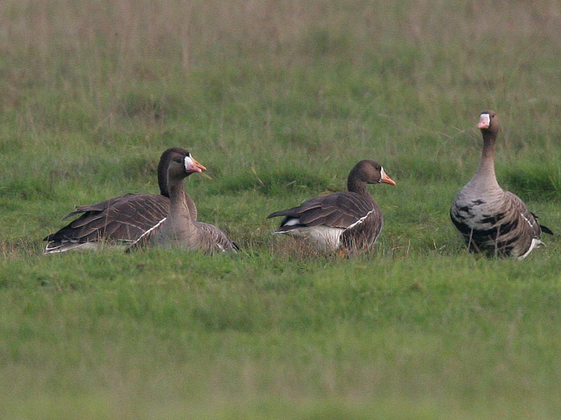 Beskrivelse: 2 Grønlandske Blisgæs med alm. blisgæs. De to formers næbfarve kan sammenlignes på de to fugle til venstre, der står lige bag hinanden.