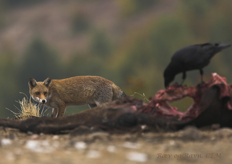 Beskrivelse: Ræven tør ikke nærme sig sålænge, Ravnen sidder på ådslet.