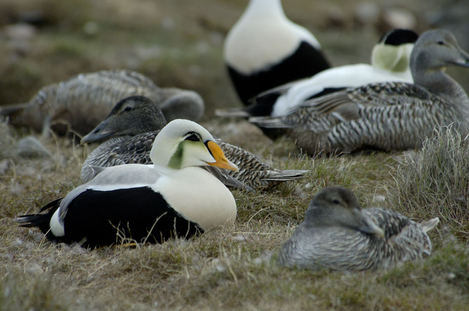 Beskrivelse: Blandt de næsten 2000 Ederfugle, der yngler blandt slædehundene ved Daneborg, lå denne smukke fugl.