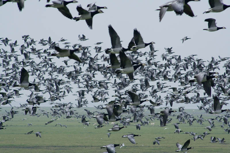 Beskrivelse: Disse Bramgæs burde lære at kende forskel på Fiskehejrer og ørne! Flere gange blev de narret på vingerne af et par Fiskehejrer. Men gav gode fotomuligheder!