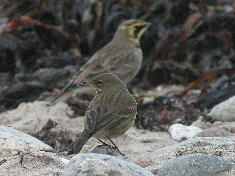 Beskrivelse: En typisk, olivengrøntonet Skærpiber, her med en usædvanlig baggrund - især efter østdanske forhold.