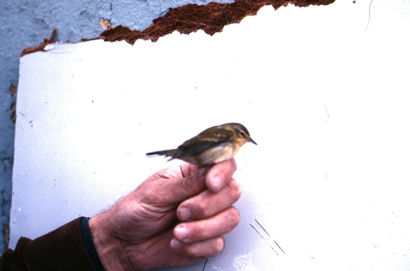 Beskrivelse: Denne Tennesseesanger udgør Færøernes eneste fund. Den opholdt sig i Sumba 21-28 september 1984. Fuglen blev ringmærket og billedet er taget af Søren Sørensen. Det er en indscanning af et gammelt dias, der er ret slidt, derfor den mindre gode kvalitet.