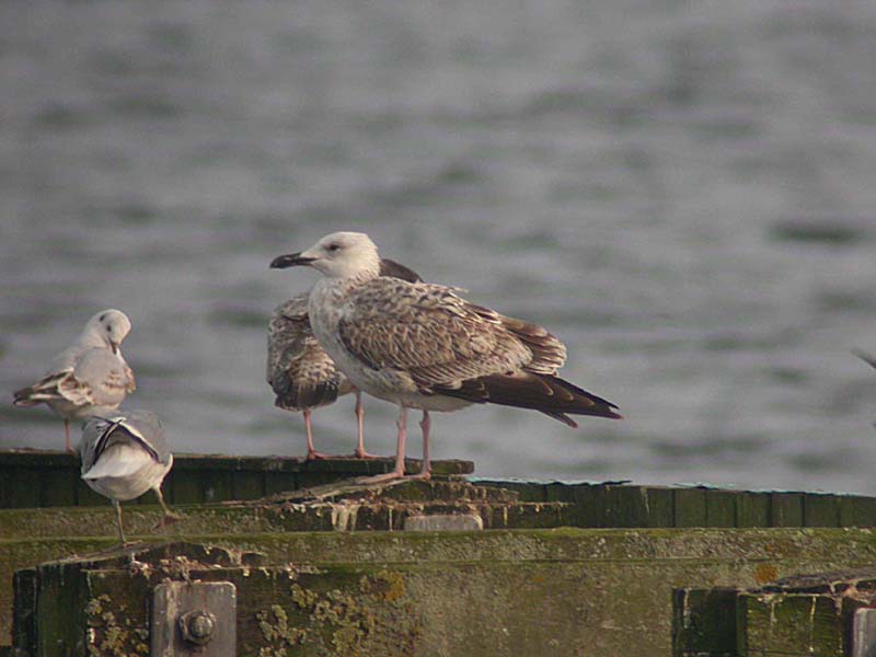 Jeg har lige læst de forskellige kommentarer til din måge på Netfugl, og selvfølgelig kan man let komme i tvivl om netop sådan et eksemplar som dit, som jo tydeligvis ligger i mellemzonen mellem Kaspisk og Middelhavs, hvor det virkelig er svært at afgøre arten 100% sikkert, når fuglen ikke ses flyve. Det er ikke nemt at pege på en enkelt afgørende faktor hverken dragtmæssigt eller strukturelt. Det hele ender let i en vis subjektivitet eller fornemmelse, og det gjorde det jo også for mit vedkommende, når jeg i første omgang i min mail til dig hævdede at kunne "udelukke" Kaspisk. Jeg synes stadig, at næbbet er ret så kraftigt for en Kaspisk, men kan godt give Klaus ret i, at det ikke er specielt højt ved basis. Panden forekommer mig heller ikke så flad som de fleste Kaspiskes, men der ér jo variation. Øjet synes jeg stadig ser forholdsvis stort ud for Kaspisk, men det er ganske vist svært på dit foto at se, hvor afgrænsningen går til de lidt mørkere fjer omkring det. Lange ben, specielt over hælen er heller ikke ligefrem slående (sml. med Sølvmågens bagved !). Ej heller vingerne er iøjnefaldende lange i forhold til halen, og desuden ser hele fuglen utroligt stor ud sammenlignet med Sølvmågen og Hættemågerne, men det kan jo som sagt være en velvoksen Kaspisk han. Desuden snyder forholdet mellem størrelser betydeligt på fotos. Jeg hæftede mig også noget ved ryggens grålige bundfarve. På dit foto ser den ikke så lys og kold grå ud som på de fleste Kaspiskes, men synes at have en varmere brun-grå tone som på mange michahellis'er ! Fotos er dog noget taknemmeligt noget og tit svære at bedømme farvemæssigt, da lysforhold og vinkler spiller meget ind.
