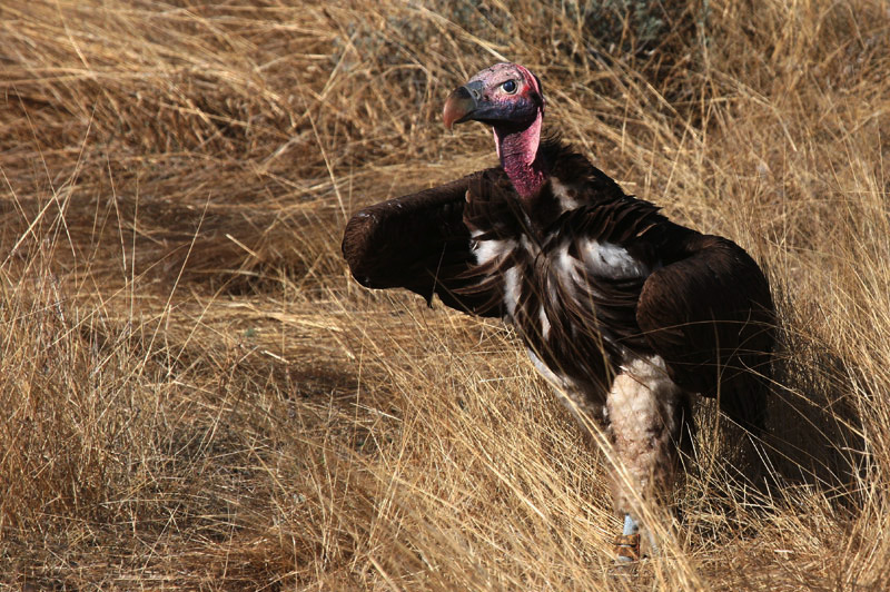 Bemærk at øregribben er ringmærket, da der i Etosha foregår et forskningsprojekt, der skal give ny viden om gribbenes levevis og dermed forhåbentlig give svaret på, hvorfor alle de store gribbe er gået stærkt tilbage i størstedelen af Afrika i de senere år.