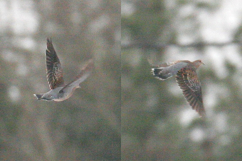 både på illustration i Fugle i Felten og på billedet til højre flyver Østlig turteldue/turteldue med hovedet hævet så der opstår en skarp vinkel mellem hals og baghoved. Det samme gjorde sig gældende for fuglen i Bække, er det et tilfælde eller...