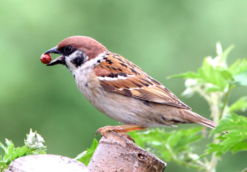Titel: Skovspurv med jordnød.