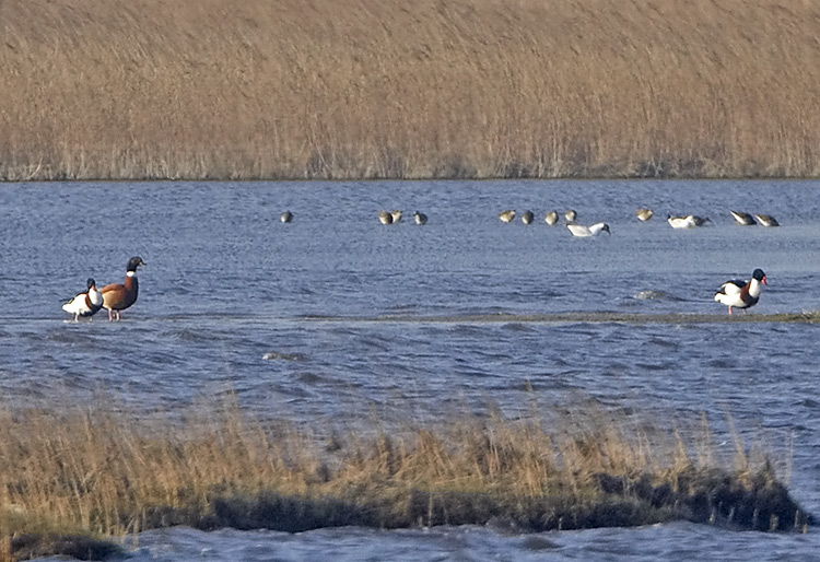 Beskrivelse: Denne fugl (el. lig.) findes også på Netfugl som Rustand x Gravand, men jeg synes nu det mest ligner en Australsk Gravand (Australian Shelduck), den gjorde ihærdig kur til Gravanden til venstre og småtoppes med Gravanden til højre. Nu er det jo efterhånden helt alm. med Australsk/Dansk kærlighedsforhold, så det....