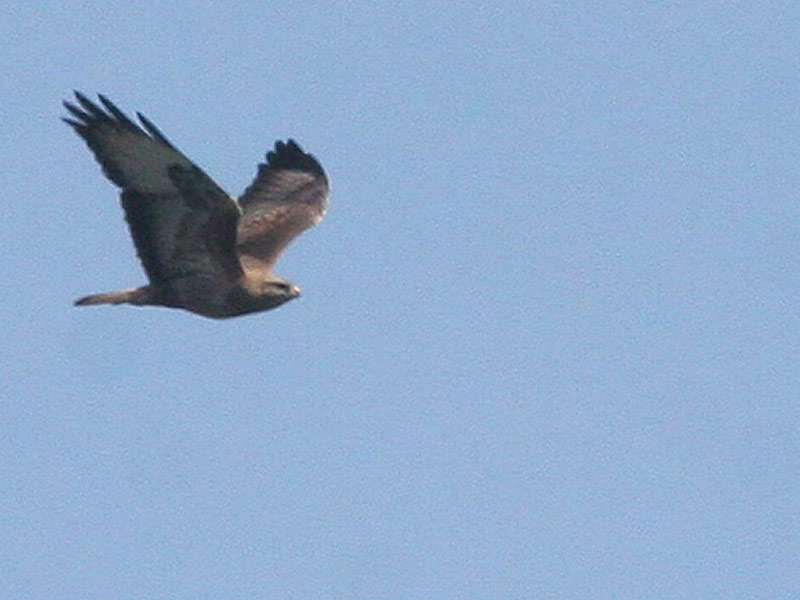 Undersidens brune partier havde også et let rødtonet anstrøg. Det var e adult med kulsort vingebagkant, og den stod ret tydeligt frem mod hvide armsvingfjer og håndflade, der havde smallere bånd end hos majoriteten buteo.