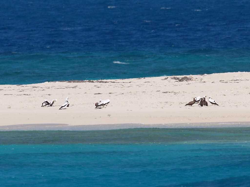 Beskrivelse: På sandbanken Hospital Key yngler flere par maskesuler. Desuden gæstes stedet tit af brune suler, som også ses på dette foto, der er taget fra katmaran på ca. 1 km afstand. Derfor den mindre gode kvalitet.