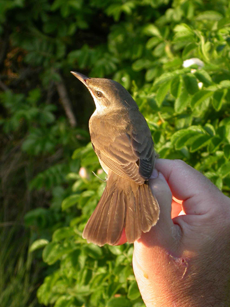 Beskrivelse: Kun 3. fund af Drosselrørsanger i Blåvand og den 2. ringmærket. Fundet af MSN, fanget af HKn, mærket af MIJ og fotograferet af UEM