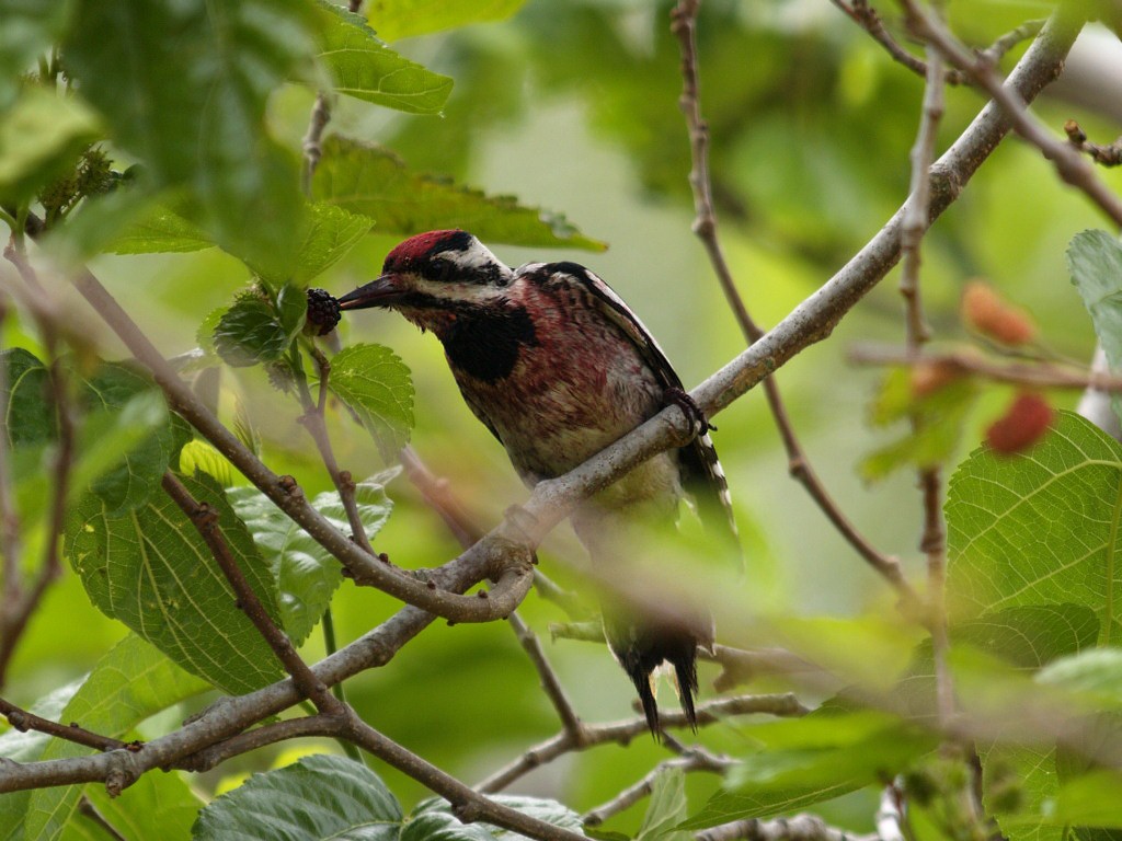 Beskrivelse: Den røde farve på brystet skyldes uhæmmet fortæring af "mulberries" uden hagesmæk. The red colour is due to the mulberries, which it fourages on.