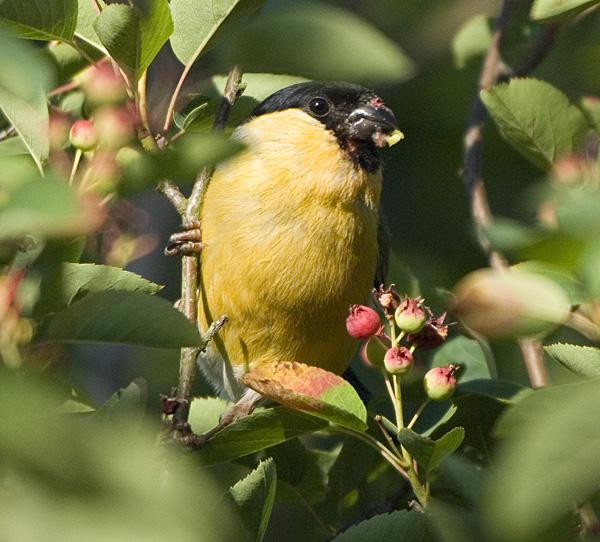 Beskrivelse: Dompap men i noget uventet farve. Ejeren af huset hvor fuglen holder til, troede det var en Hætteværling, ikke uforståeligt - helt gul fugl med sort oven på hoved.