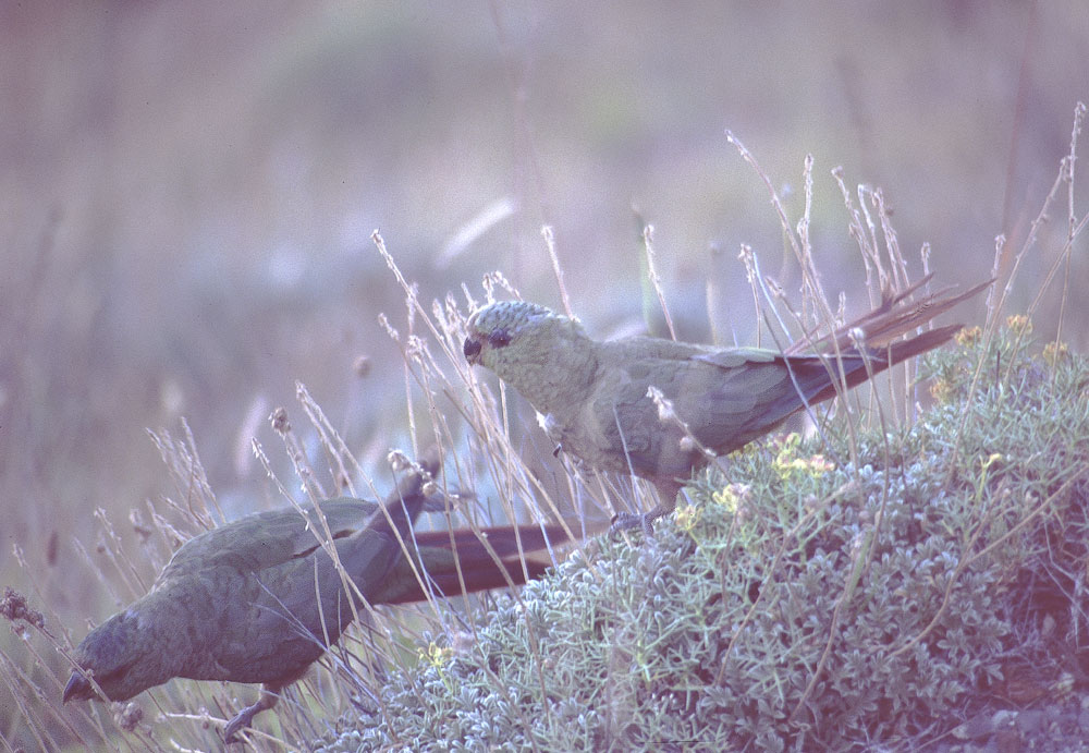 Beskrivelse: Smaragdparakit er en art som man finder i Andesbjergenes araucano-skov. Her fouragerer de bl.a. i højt græs som her.