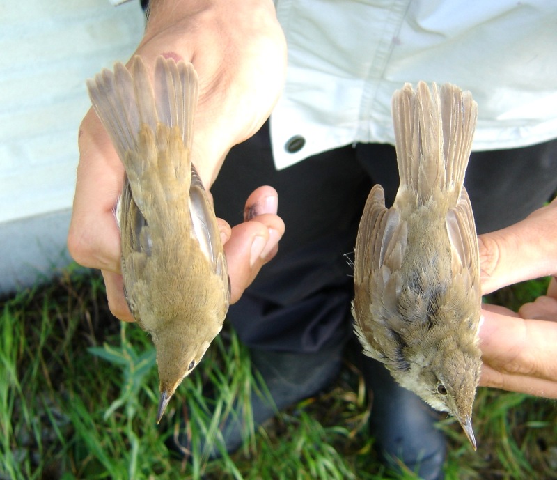 Beskrivelse: En 2k+ Buskrørsanger med slidt fjerdragt (til højre) sammen med en 1k Kærsanger, begge ringmærket af Jesper Brinkmann. Læg mærke til den meget korte håndsvingfjerprojektion.