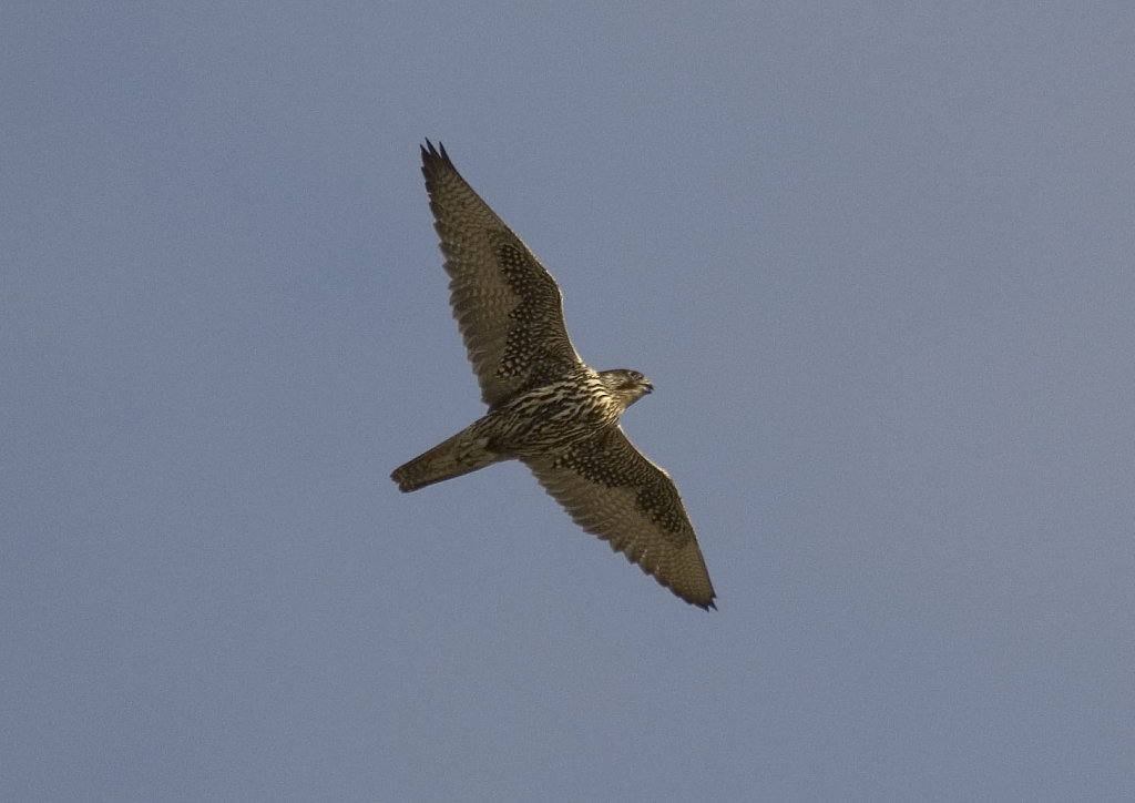 Jeg så en jagtfalk den 14/9 2007 ca 12.00 midt i Hanstholm vildtreservat, mellem Hykær og Søndre Skovhus. Jeg fulgt kanten af det lukkede område. Jeg antager at det er den samme fugl som du har fotograferet. Det er på størrelsen og den lange hale jeg kan sige at det er jagtfalk. Afstanden ca 100 m, den strøg ind over et område 2 gange i lav hurtig flugt.