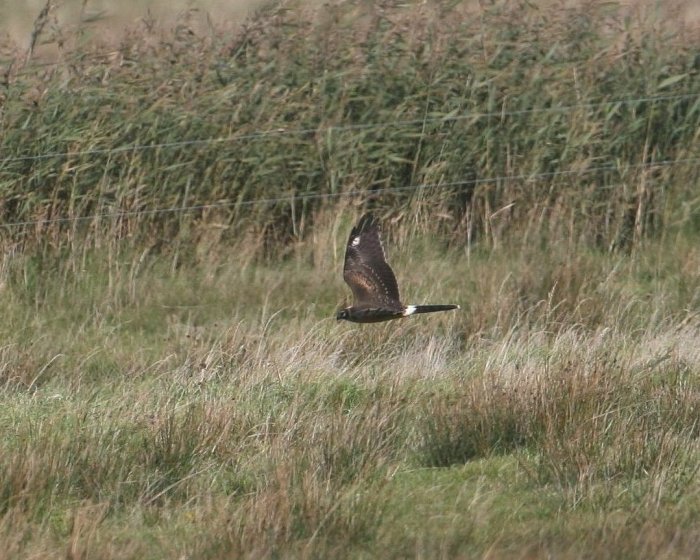 I think this is very likely a juvenile Hen Harrier (Circus Cyaneus). The wing looks broad, the white rump quite extensive and I can just about make out five fingers on the hand of the wing. Did you see the underside? Mvh Terry