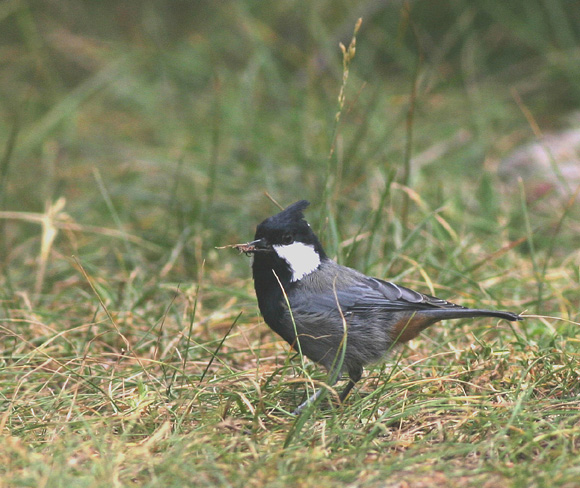 Beskrivelse: Ses oftest højt i store nåletræer, men denne havde i stedet fundet noget spiseligt på skovbunden. På dette foto ses intet rustfarvet på baghalsen, men det er der, når fuglen ses i andre stillinger, f.eks. når den holder hovedet mere foroverbøjet.