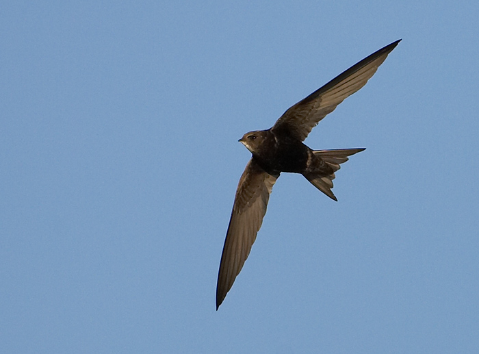 I forbindelse med en lille gennemgang af fotos af sejlere i netfugl´s galleri faldt jeg lige over denne Mursejler. Intet er mistænkeligt ved denne Mursejler. Sortbrun dragt. Lille hvid strubeplet. Mørke undervingedækfjer - også de mellemste og store. En anden meget sikker karakter på Mursejler, som er iøjnefaldende her, er at den yderste halefjer (T5) er tydeligt længere end den næst yderste (T4) og at førstnævnte i øvrigt er tydeligt tilspidset.