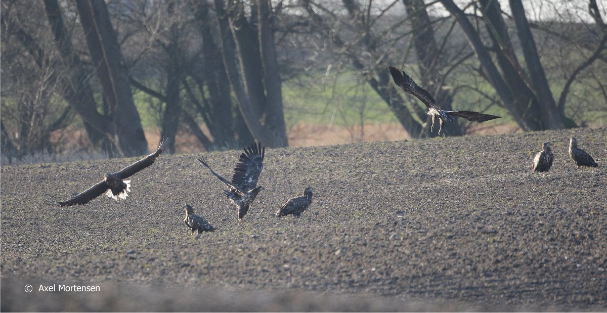 Beskrivelse: Et større antal havørne havde sat hinanden stævne på en afsides beliggende mark ved Sillesjö - der blev optalt min. 8-9 stk.