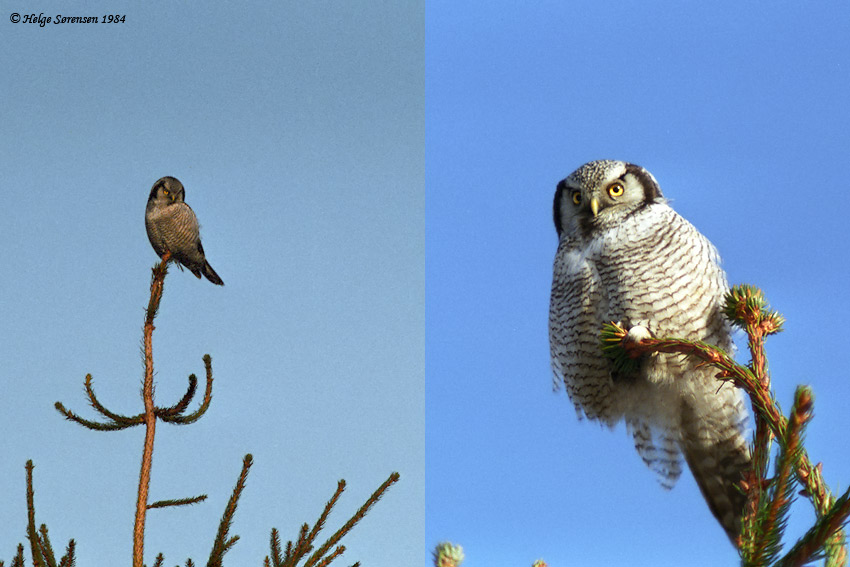 Beskrivelse: De to Høgeugler som holdt til ved Oxbjerget i vinteren 1983/84.