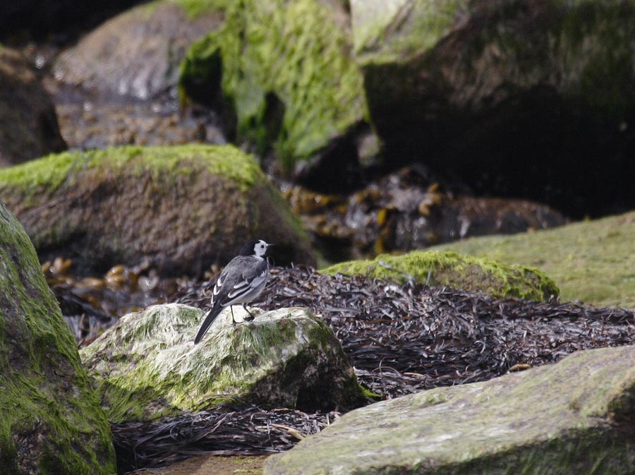Beskrivelse: Denne temmelig mørkryggede hvide vipstjert rastede kortvarigt langs kysten ved Klydesøen på Vestamager. Vi mente først det kunne være en hunfarvet yarrellii, men blev dog enige om at den nok ikke er helt ren. Da den bl.a. burde have lidt mørkere overgump, der strækker sig længere op ad ryggen.