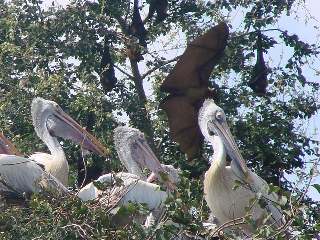 Beskrivelse: Spot-billed Pelicans (Pelecanus philippensis) share their home with Indian flying foxes - (PTEROPUS GIGANTEUS)