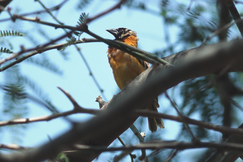 Beskrivelse: Der var mange Village-Weavers (rødt øje), og en del weavers i vinterdragt med sort øje. Jeg antog at det drejede sig om hanner i vinterdragt, min litteratur er lidt sparsom på dette område, og så denne ene i fældning til yngledragt. Hunner har lyst øje.