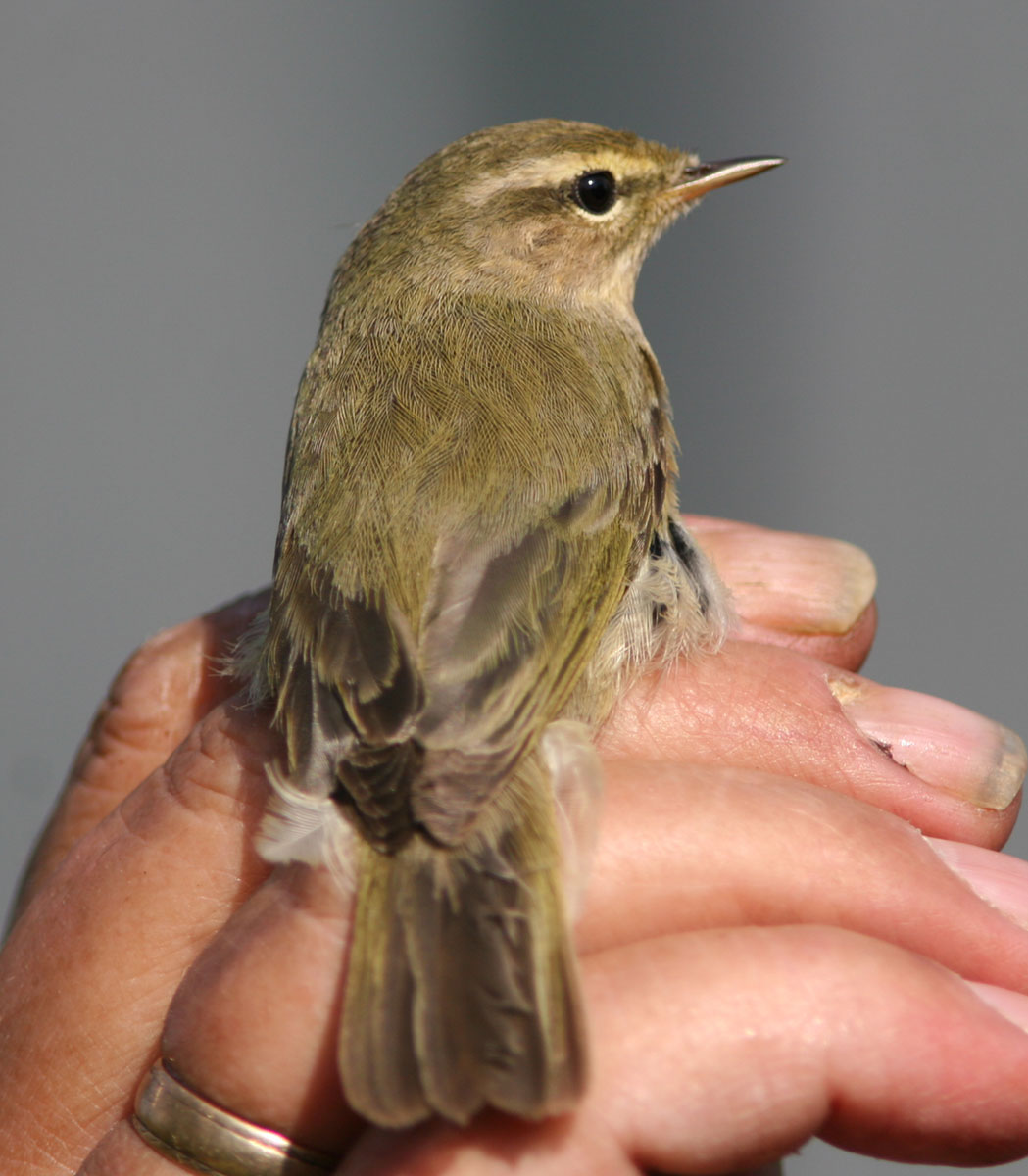 Beskrivelse: Fuglen tog sig umiddelbart ud som en Løvsanger med sin grønlige dragt og kraftige øjenbrynsstribe. Benene var desuden brunlige og lysere end Gransanger. Den syntes dog ufatteligt lille, og hånden var slående kort i forhold til Løvsanger. En nærmere inspektion afslørede indskæring i P6, hvorfor Løvsanger kunne udelukkes. Allemålene pege dog også på en særdeles lille fugl, faktisk mindre end de intervaller der er angivet for Gransanger af Svensson, mht. vingelængde. De biometriske mål følger.