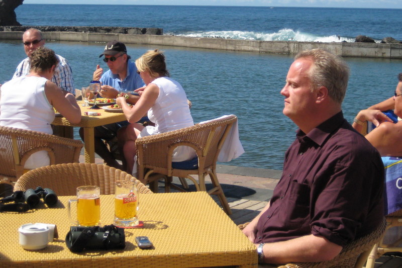 Beskrivelse: Anders Søgaard nyder solen og en velfortjent fadøl efter hejre fotografering indtil den fløj sydpå (se Anders foto). Louie havde sat sig på molekant, og kan ses th lige over Anders hoved, tv en lille spove og en halv snes stenvendere.