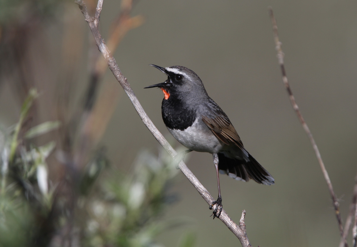 Beskrivelse: Mikstures logofugl for fuld udblæsning en solbeskinnet morgen i det østlige Kirgisien. Blev vækket af hannen som sad i pilebevoksningen 25 meter fra teltet. Normalt er hannen sky og utilnærmelig - lige med undtagelse af ynglepeioden hvor den nidkært vogter territoriet. Således er det også perioden hvor man rigtigt kan nyde rubinens smukke farvespil. Rubinnattergale-hannerne er diskrete med fremvisningen af den iøjenfaldende strubeplet, og oftes ser man fuglen uden at få øje på rubinen - men når det lykkes... går alt op i en højere enhed, og fuglens navn bliver (ind)lysende. Dens nære slægtning Rubinnattergal Luscinia calliope, forekommer længere nordpå, langs den kasakhstansk-russiske grænse i Altai-bjergene, og de to arter overlapper ikke - hverken geografisk eller biotopmæssigt. Himalaya Rubinnattergalen opholder sig generelt højere (denne er fotograferet i 2751 m.o.h.) og Rubinnattergal i 1.450 - 1.900 m.o.h.