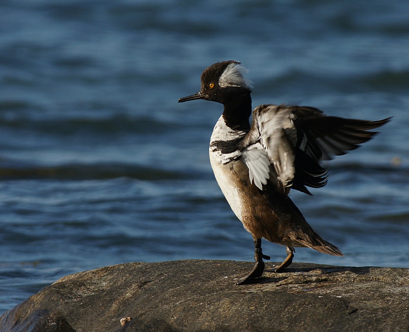 Beskrivelse: Ved stranden i Gilleleje først på aftenen. Den svømmede rundt med en flok gråænder, men kravlede så op på en sten og nettede sig.