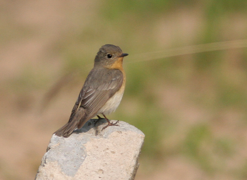 Beskrivelse: Også hunnen af Mugimaki Fluesnapper er karakteristisk. Bemærk det udbredte orangetonede bryst, det svage vingebånd (i stil med Lundsanger!) og den ensfarvede hale; hanner har hvide sider nderst på halen ala Lille og Tajgafluesnapper.